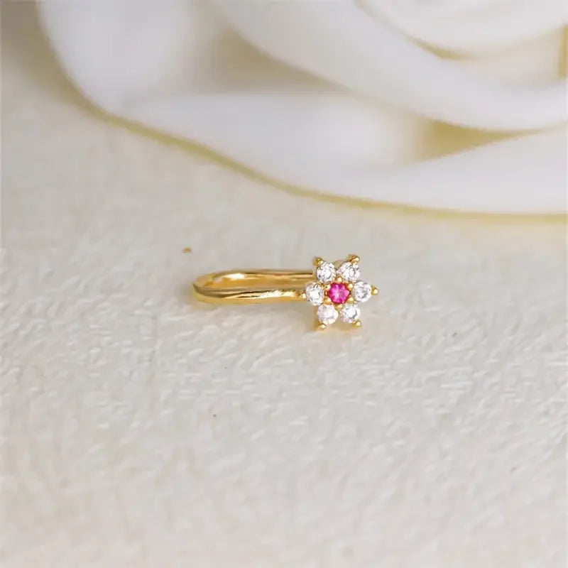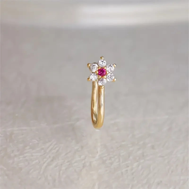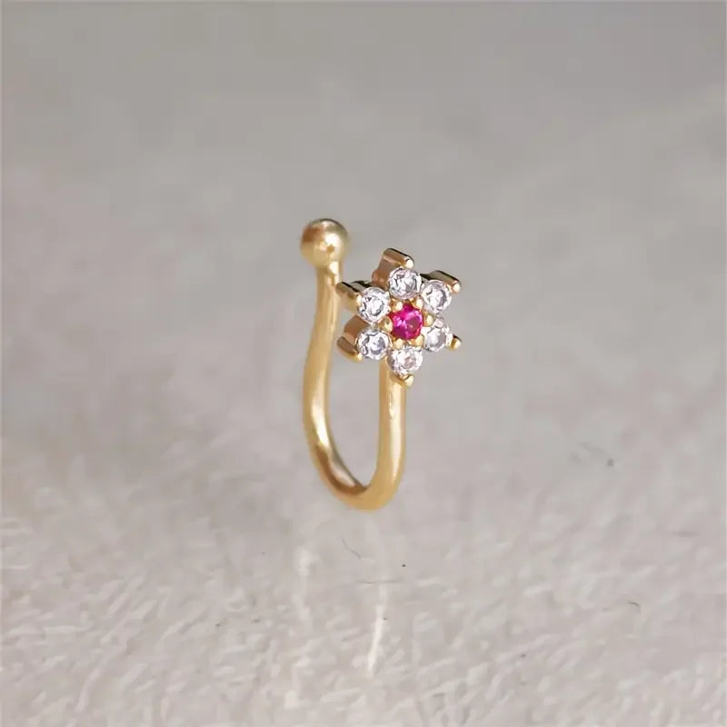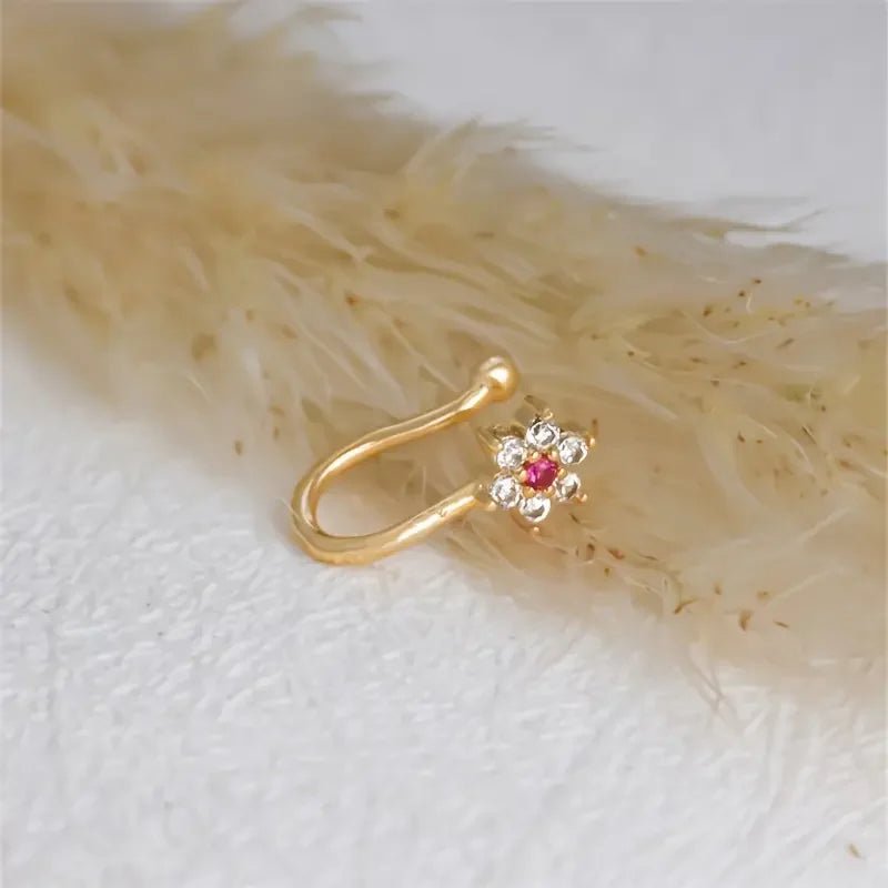 Découvrez notre pince-nez Lulu, un bijou facial bohème qui allie la délicatesse d'une fleur rose à l'éclat d'une zircone synthétique rouge. Sa forme en U réglable épouse parfaitement les courbes de votre nez pour un confort optimal, vous permettant d'adopter un style unique sans engagement permanent.